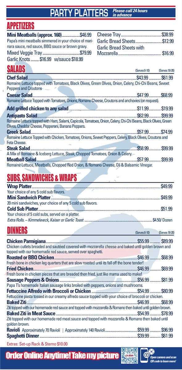 Served with one meatball. Parmesan- $1.00/ Extra Meatballs add $1.65 each/ Extra Gralic Stick .60 each